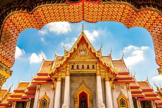 Visit Wat Traimit, Wat Pho and the Grand Palace exterior; stroll through historic neighborhoods and markets. Afternoon free for shopping or a river cruise. Evening Thai dinner and optional rooftop bar experience